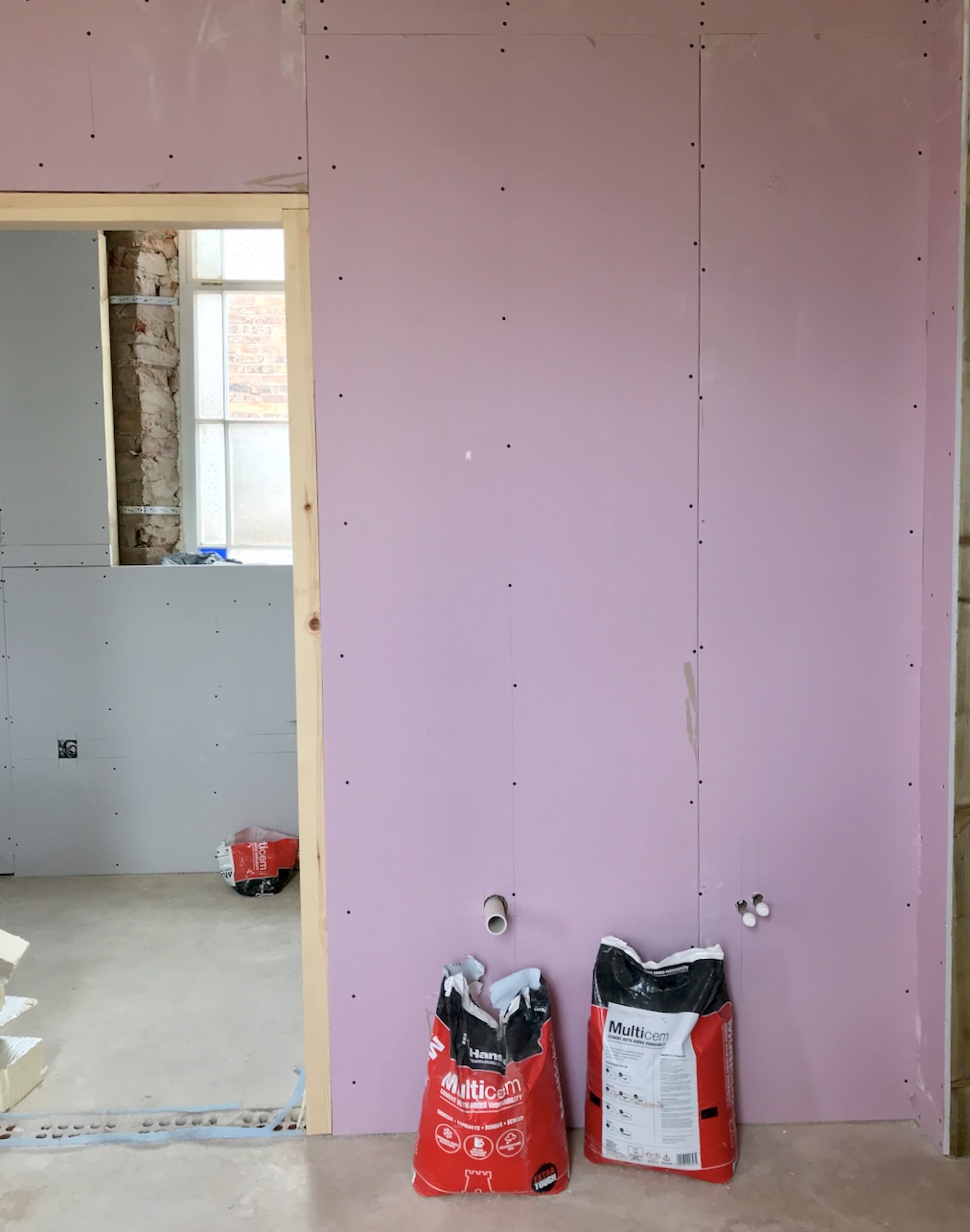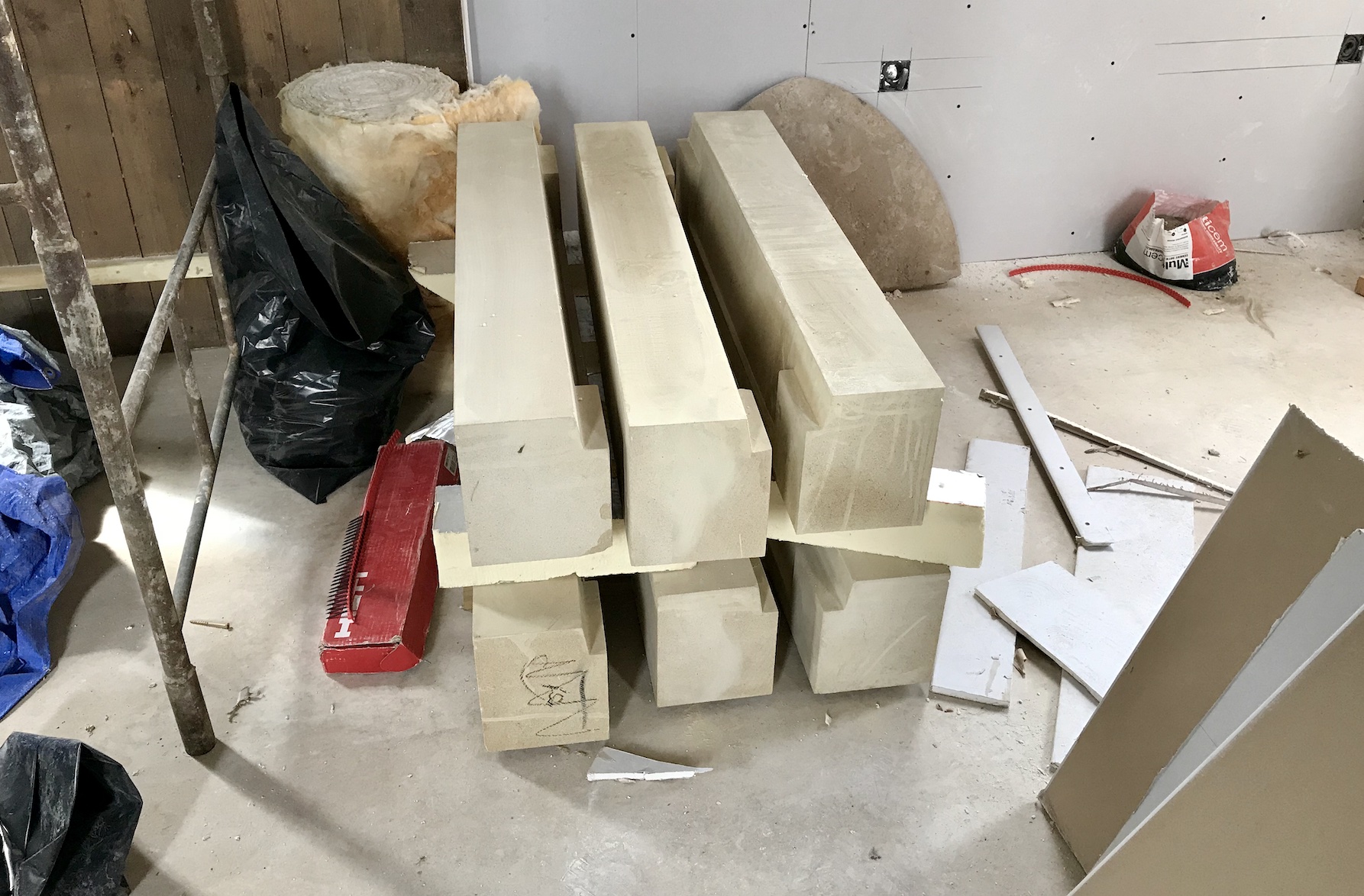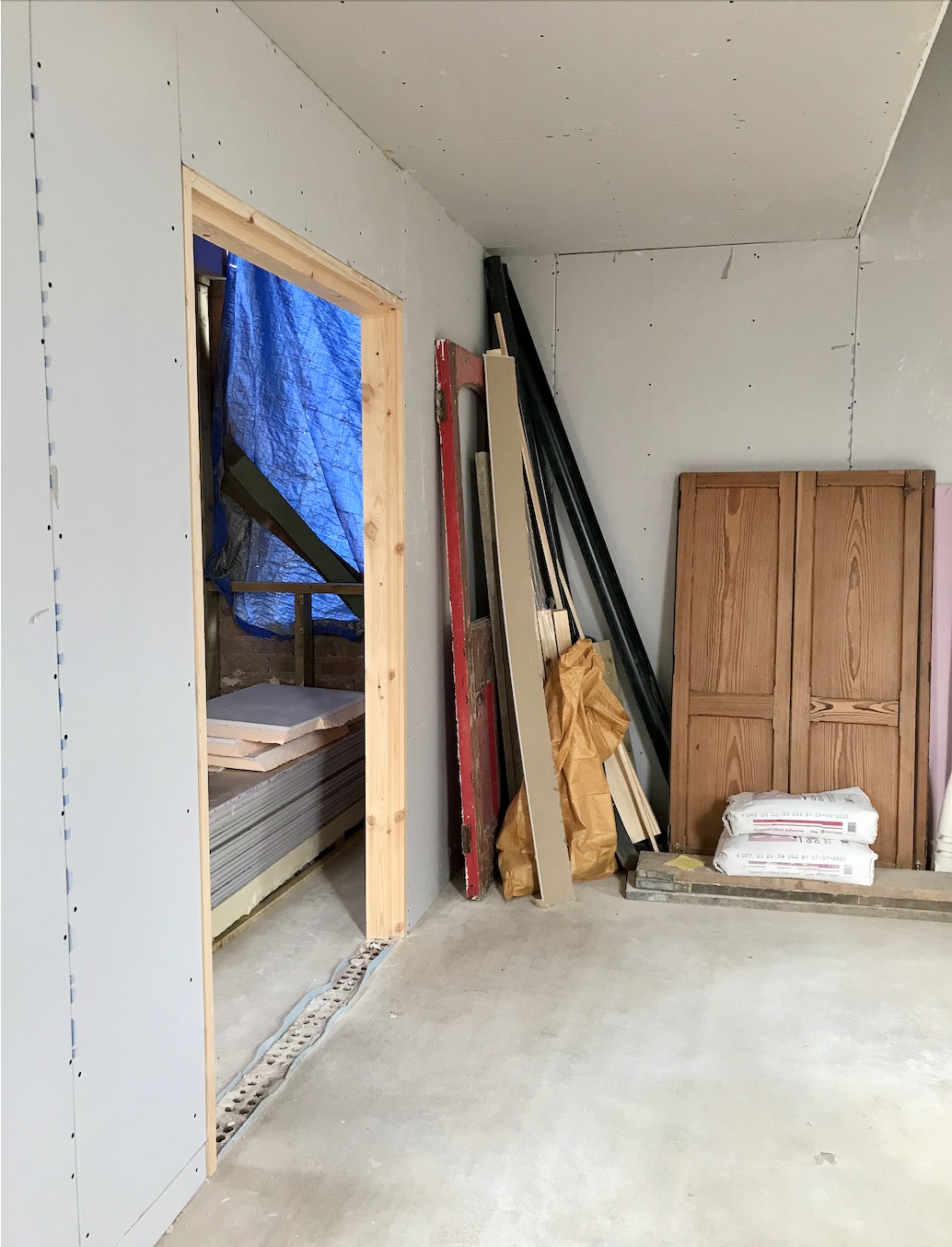 Meanwhile, inside was looking extremely exciting! We took delivery of what felt like a mountain of boards – insulation for the walls, plus a big stack of plaster boards, fire boards and more in preparation for the boarders. First though, the insulation was fitted like a large, shiny jigsaw puzzle in the walls over the weekend! Rolls of insulation also went into the stud work too.