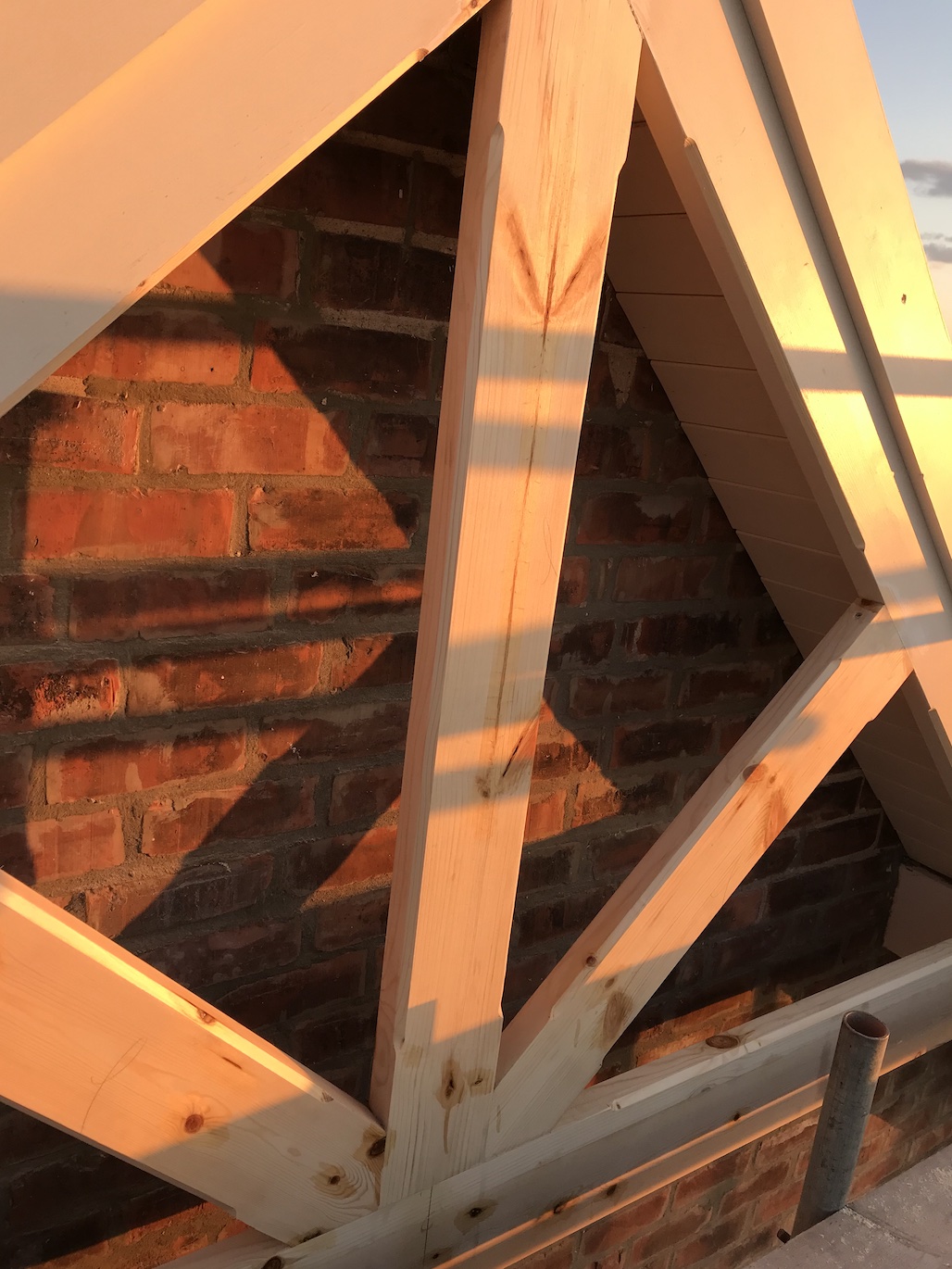 …And it’s up! Their attention to detail is just brilliant and they added in the little notched and chamfered details that also appears on many of the other woodworks at the Chapel. You can see a closer look in the image below, centre. We applied some knotting solution to the wood that evening to prepare for priming the following day as the sun was going down.