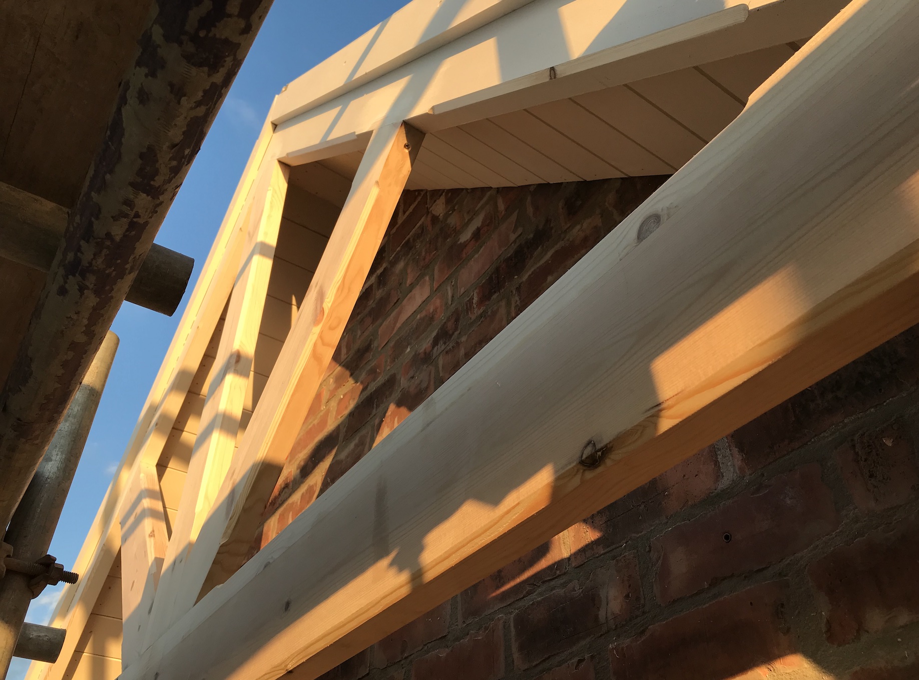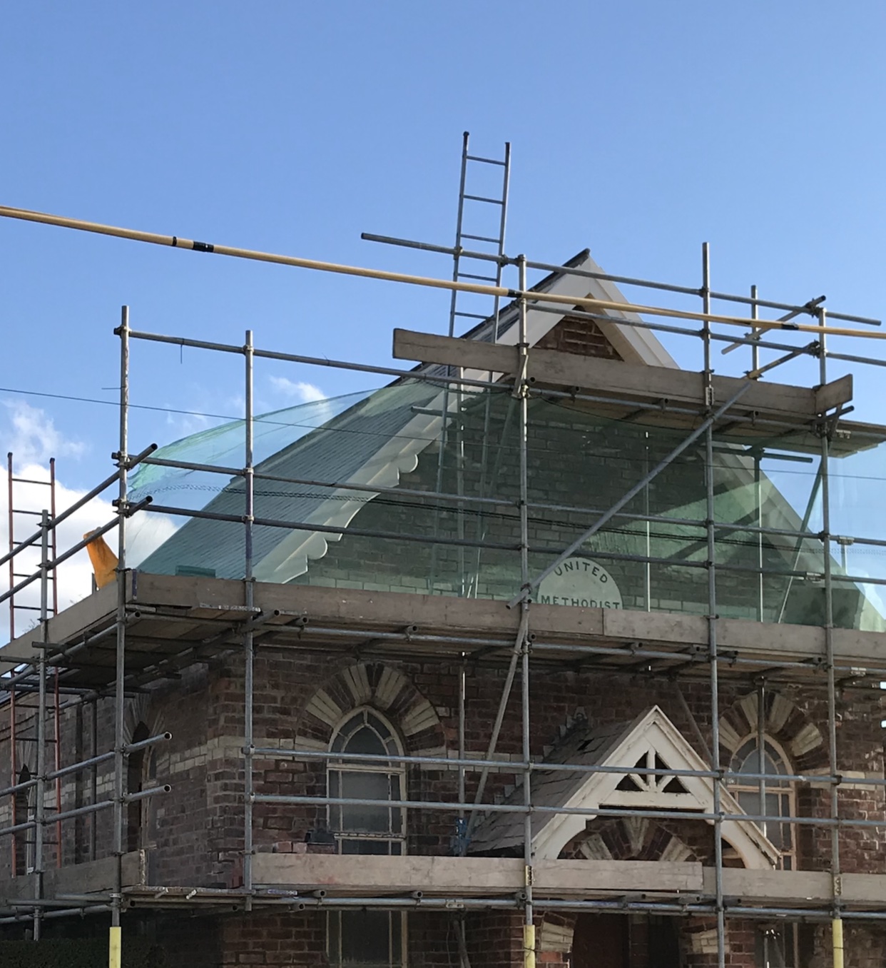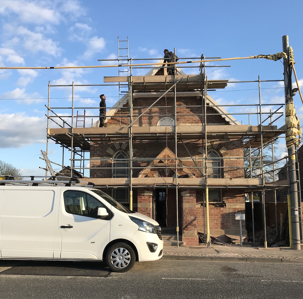 As I mentioned in the previous renovation post, the fascia boards were re-made to replace the existing ones on the Chapel. These were pretty weatherbeaten and rotten in places so it made sense at this point to give the woodworks at the front of the building some care and attention. We wanted to invest in doing the repairs at this stage in the renovation to preserve the exterior of the building for the future. It was also much, much easier with the scaffold in place for the brickies and roofers!