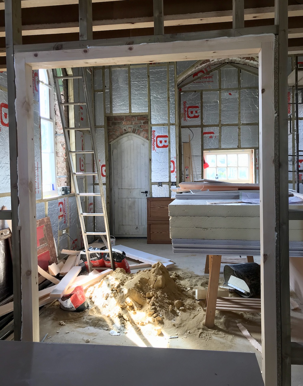 Swiftly after the insulation was installed, the boarders came to the Chapel. They set about working their way throughout the interior and over the space of a few evenings, the walls were looking very different indeed. A few months after removing the lath and plaster ceiling, it felt great to see a ceiling once again. Architecturally it’s quite a feature of the space and looks beautiful from the new mezzanine level now.